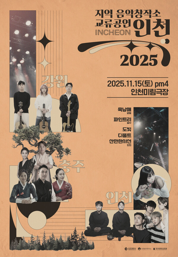 (문화뉴스 백현우 기자) 인천음악창작소가 주최하는 2025 지역음악창작소 교류 기획공연 ‘인천’이 오는 11월 15(토) 오후 4시, 인천 미림극장에서 열린다. 이번 공연은 인천, 충주, 강원 지역 음악창작소가 함께 만드는 교류 무대로, 지역 간 협업과 창작 교류를 확대하기 위해 기획되었다.